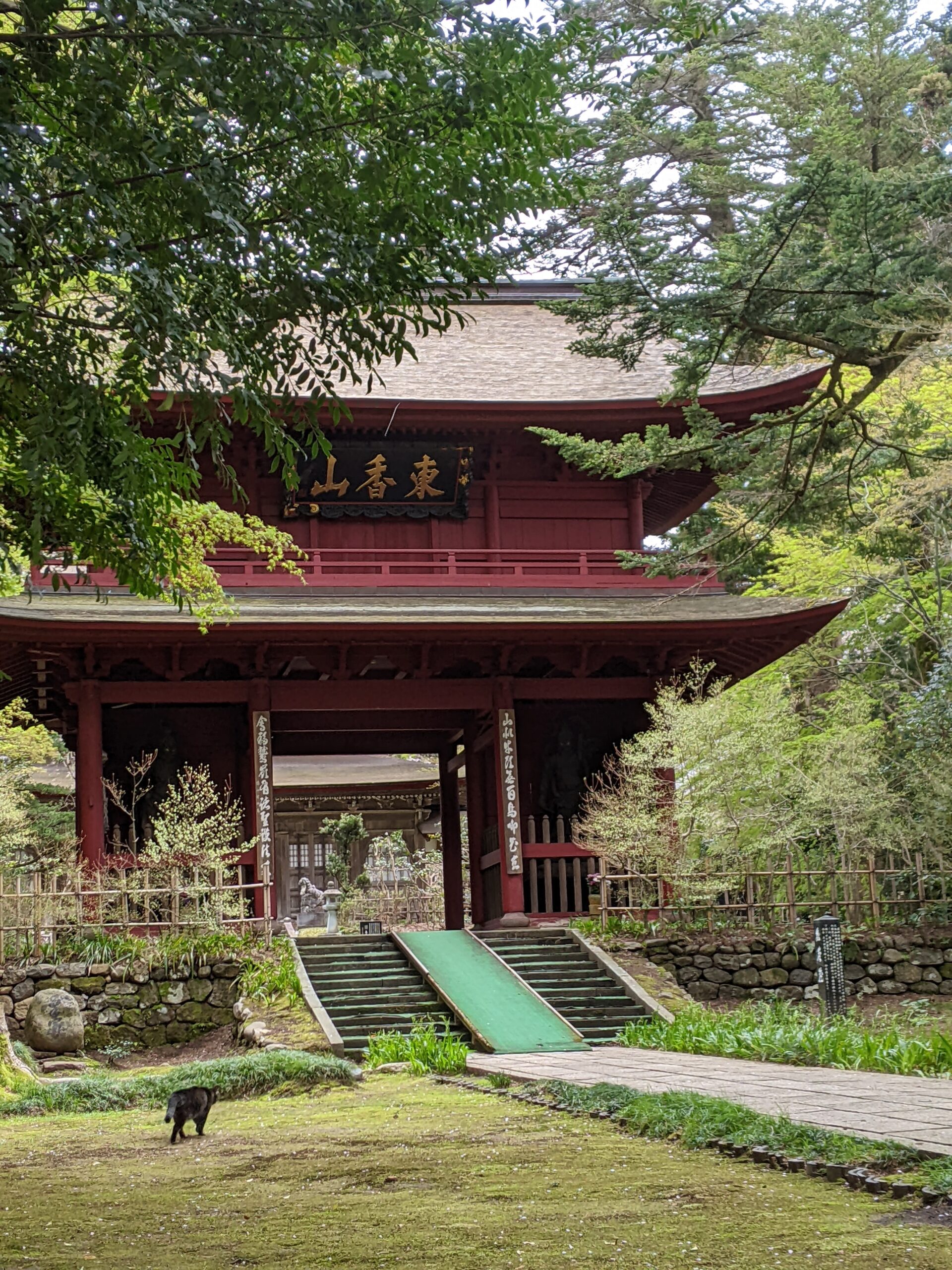 県文化財。第二の門。赤い見た目のために赤門と呼ばれる。寛永15年(1638)、大乗寺二十一世超山誾越和尚の代に建立され、元禄年間に現在地に移築されたと伝承される。楼上に釈迦牟尼仏、迦葉尊者・阿難尊者、十六羅漢を祀る。